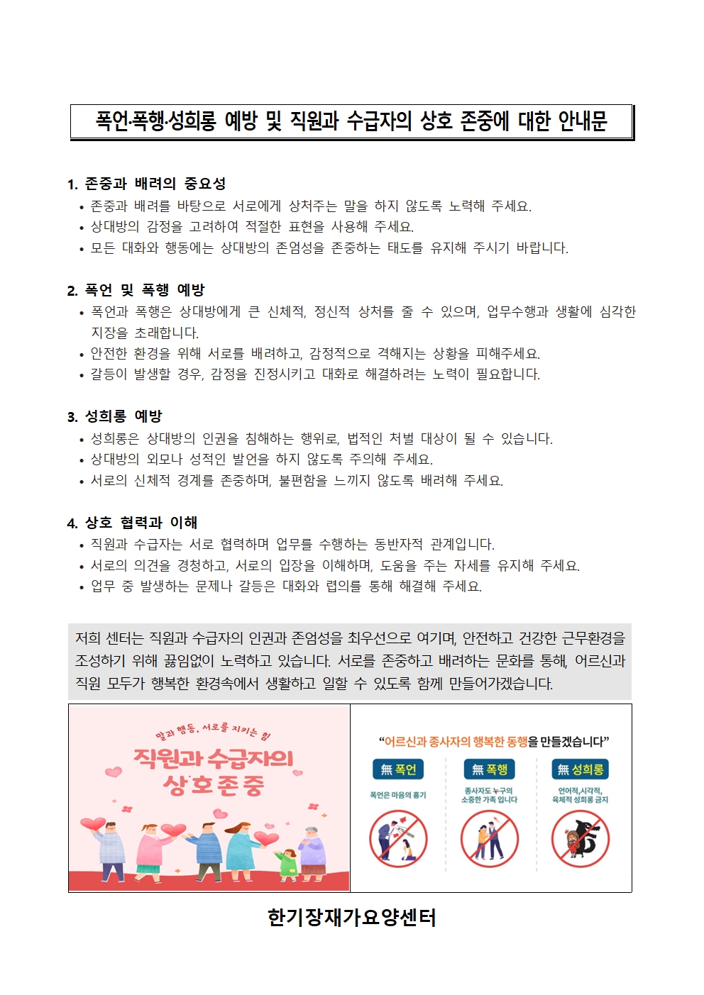 산업안전보건법 등 관련 법에 따라 폭언·폭행·성희롱 예방 및 직원과 수급자의 상호 존중에 관한 사항을 안내 하오니 서비스 이용에 참고 하여 주시면 감사하겠습니다.